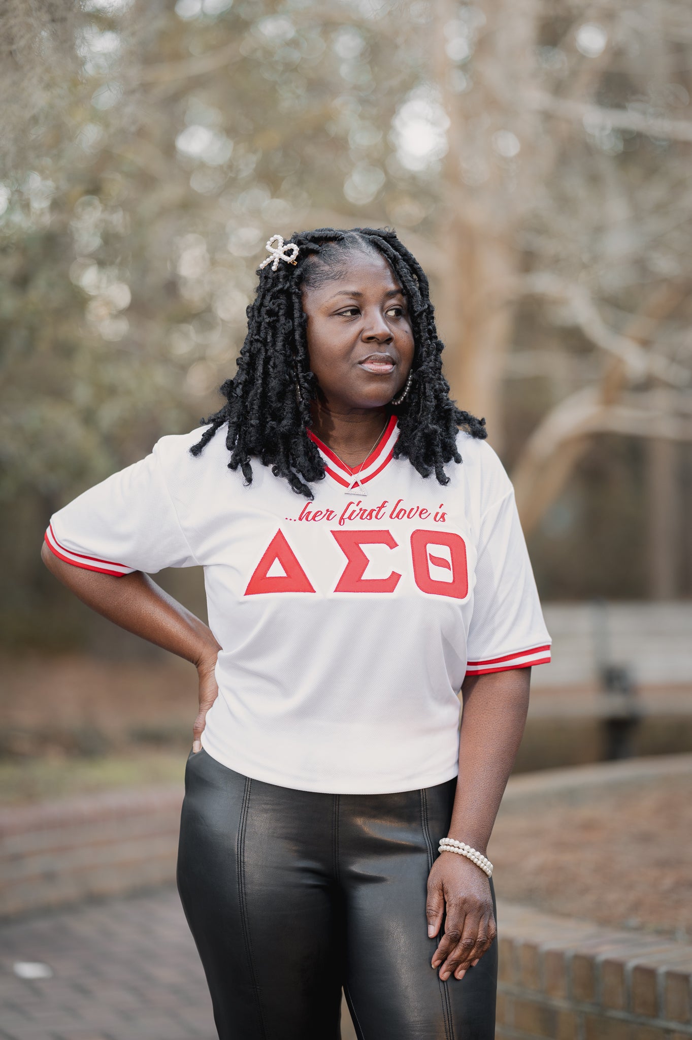 This v-neck jersey is available in two style options. The first option is pictured with the “Greek” letters for Delta Sigma Theta. The second design options features her first love is DST. Please choose the appropriate design based on your needs. The jersey material is soft and lightweight and does run large. Please keep this in mind when placing your order. Ordering down a size is a recommendation only.
